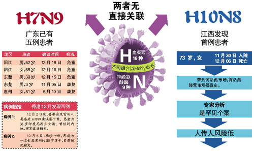 中國疾病預(yù)防控制中心、江西省疾控中心等機(jī)構(gòu)的研究人員報(bào)告說,去年11月30日,江西省南昌市一名73歲女性因發(fā)燒入院治療,之后出現(xiàn)多器官功能衰竭,于12月6日死亡。這名女子在發(fā)病前4天曾去過活禽市場(chǎng)。研究人員在該病例的化驗(yàn)樣本中檢測(cè)出甲型流感病毒,并進(jìn)一步確定為新型H10N8禽流感病毒。