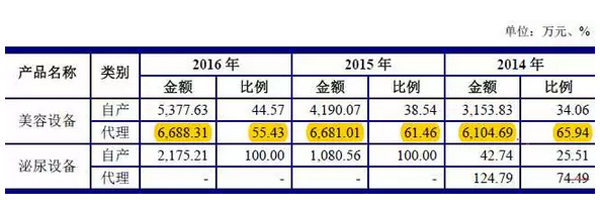 從金額數(shù)量上可以看出,公司在2016年之前仍然以代理產(chǎn)品為主,2014年代理的設(shè)備占總銷售設(shè)備額的65%以上,往后代理設(shè)備的比例呈現(xiàn)遞減的趨勢。
