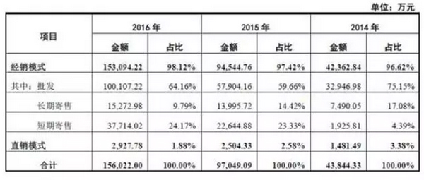 報告期內(nèi)公司銷售收入主要來源于經(jīng)銷模式業(yè)務(wù)收入,占比分別為96.62%、97.42%和98.12%。