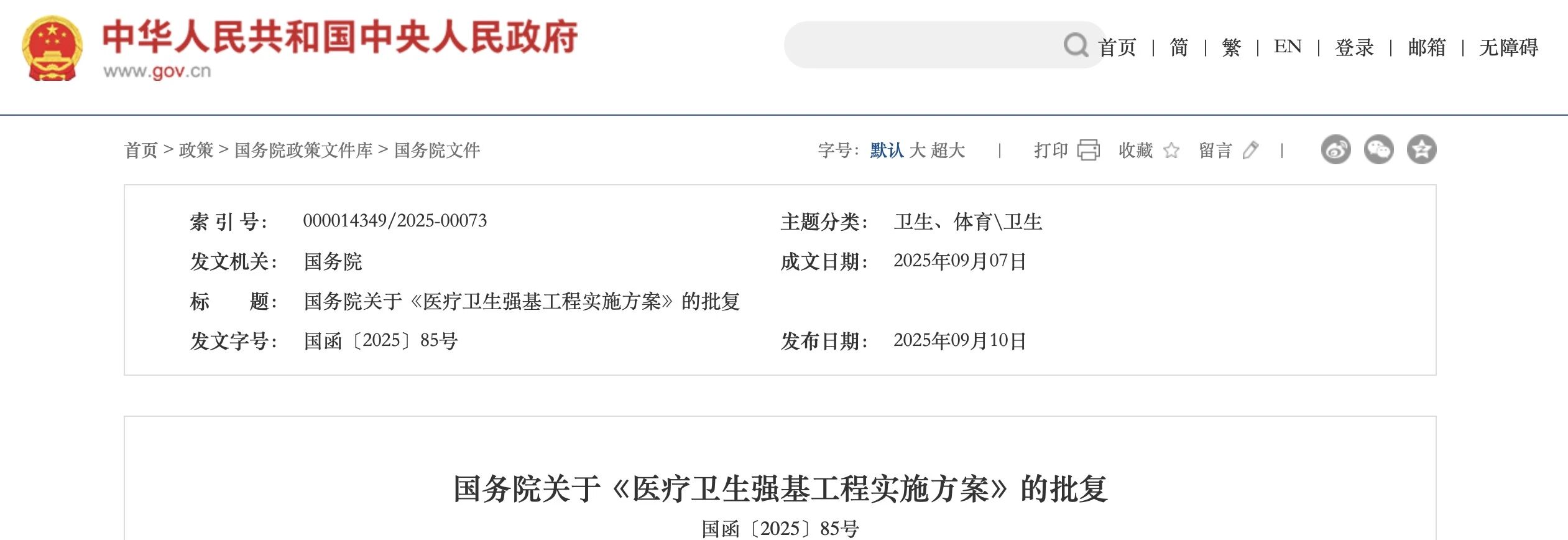 9月10日,據(jù)中國(guó)政府網(wǎng)消息,國(guó)務(wù)院批復(fù)同意《醫(yī)療衛(wèi)生強(qiáng)基工程實(shí)施方案》(簡(jiǎn)稱(chēng)《實(shí)施方案》),并附上方案全文。